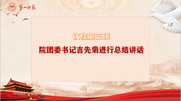 会议第二项,由团委副书记王思思对当前重点工作进行布置。王思思强调了“劳动教育”的具体改进细则,“六进公寓”活动的优化规划以及“部门素拓”具体要求等,使全体干部更加明确重点工作任务与工作要求,更好地履职尽责。