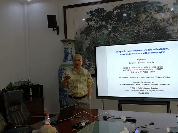 乔志军教授作了题为《Integrable two-component models with peakons, weak kink solutions and their interplaying》的学术报告,介绍了CH方程、DP方程、FORQ方程、Novikov方程的相关背景,详细阐述了两组分可积方程的Lax对和一些新的解。