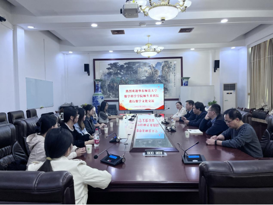 陈爱永向华东师大交流团介绍我院正在探索新型育人模式——“润之英才班”。他指出数学文化是提升“润之英才班”学生数学素养的重要载体。数学话剧将艺术演绎与枯燥的数学理论结合,是传播数学文化的一种创新方式。