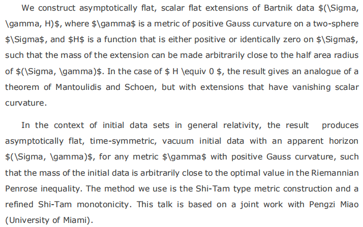 11月6日复旦大学谢纳庆教授应邀到我校讲学指导 发布时间:2019-11-03 作者: 浏览次数:次 报告时间:2019年11月6日8:50-9:50 报告地点:数学院会议室 报告题目:Bartnik mass via vacuum extensions 报告人:复旦大学谢纳庆教授 邀请人:何孝凯 报告摘要: