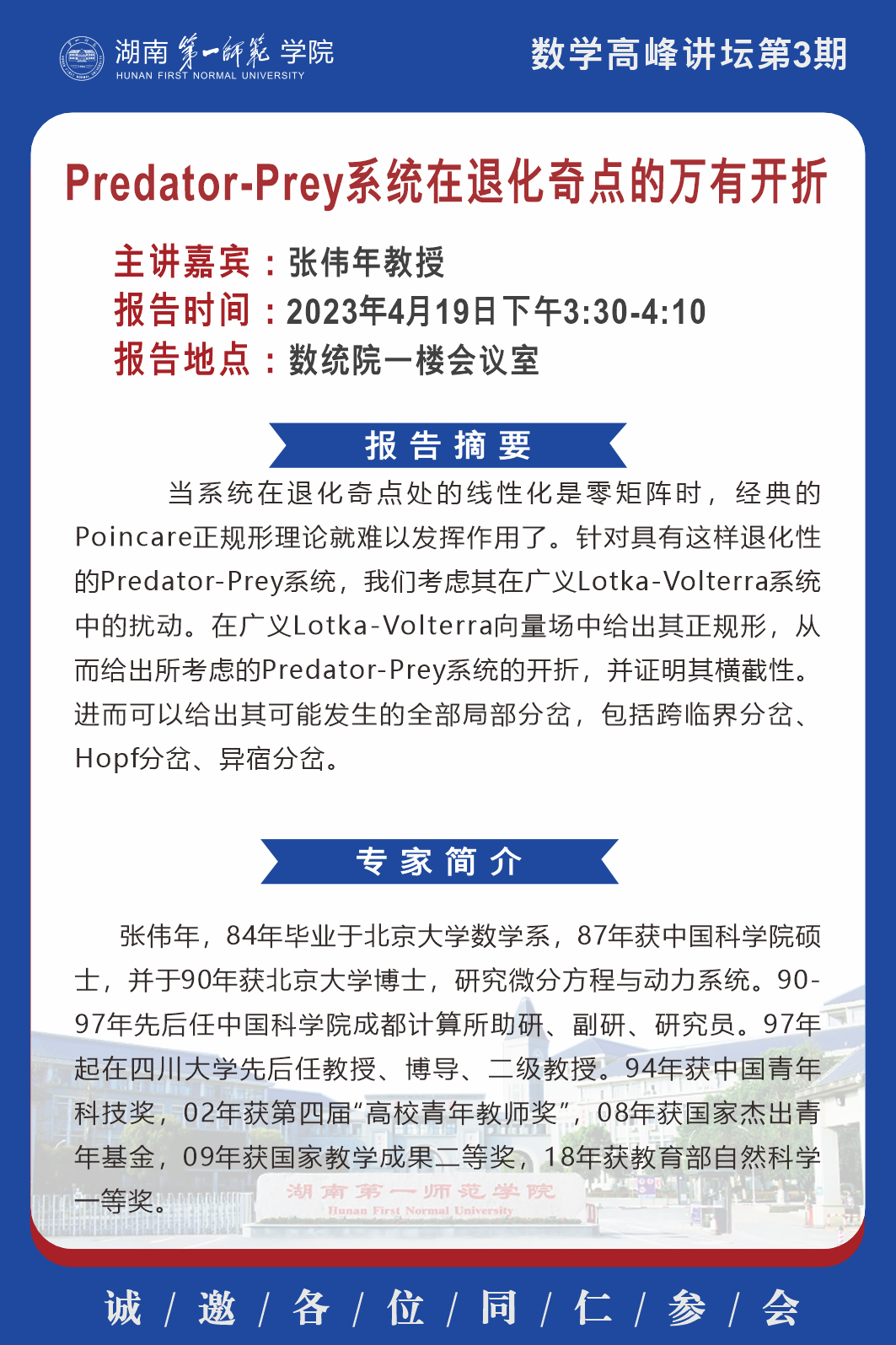 学术报告|数学高峰讲坛第3期:Predator-Prey系统在退化奇点的万有开折