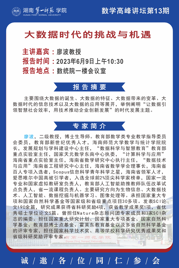 学术报告|数学高峰讲坛第13期:大数据时代的挑战与机遇