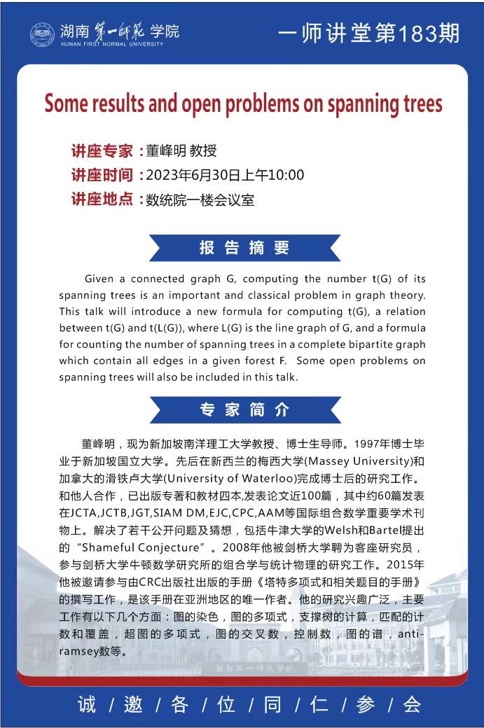 学术报告|数学高峰讲坛第15期:Some results and open problems on spanning trees
