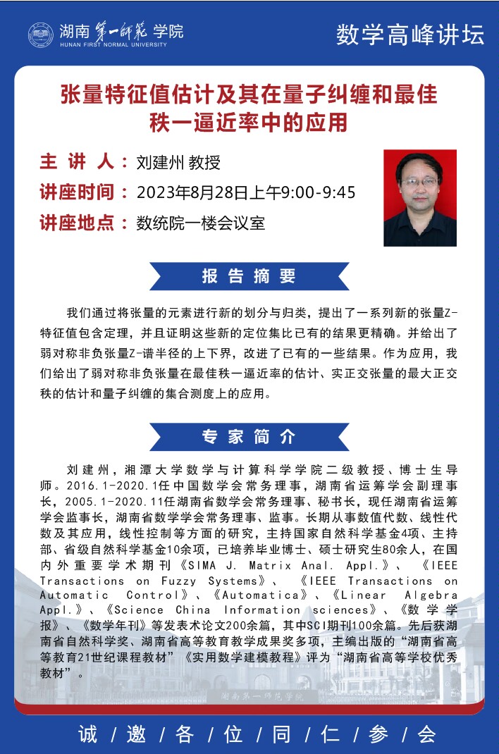 学术报告|数学高峰讲坛第16期:张量特征值估计及其在量子纠缠和最佳秩一逼近率中的应用