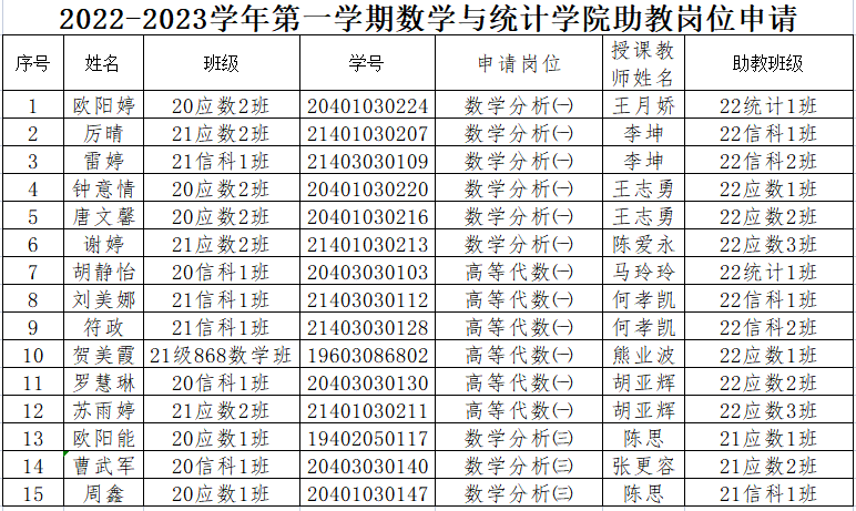 2022-2023学年第一学期伟的国际1946bv 教学助理推荐人选公示 发布时间:2022-09-28 作者: 浏览次数:次 根据《伟的国际1946bv教学助理制度实施办法》,经个人申请、任课老师推荐及学院审核,拟推荐以下同学担任2022-2023学年第一学期伟的国际1946bv教学助理,名单如下: 公示时间为9月27日-9月30日。如有异议,请在公示期内向学院王增赟副院长处反映(不受理匿名举报),或者实名发邮件至伟的国际1946bv邮箱:sjy@hnfnu.edu.cn。 伟的国际1946bv 2022年9月27日