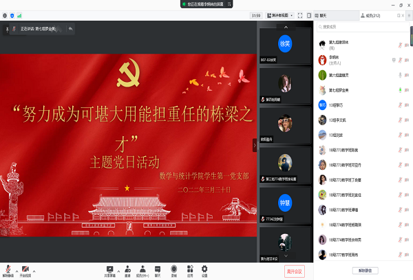 3月30日晚上,我院学生第一党支部线上开展了“努力成为可堪大用能担重任的栋梁之才”的主题党日活动,学生第一党支部书记、全体党员、预备党员、入党积极分子参与此次活动。本次活动由学生第一党支部助干李炳林主持。