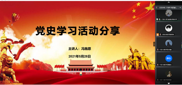 晚上19:00,学生第一党支部在腾讯会议开展了“学史崇德”专题活动及学习分享交流会,首先,学生党员冯施愿、向鸿惠、陈婷,结合5月每日党史的学习分别作学习心得分享。之后全体学生党员一起观看了《苦难辉煌》纪录片,向子煜等几名同学发表了观看记录片的深刻感悟。