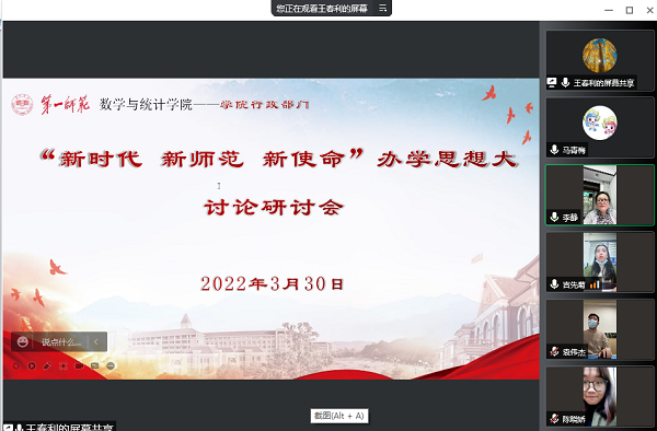 为深入开展“新时代 新师范 新使命”办学思想大讨论,进一步提高学院办学水平和办学质量,实现学院的科学发展、创新发展、快速发展,打造高水平有特色的新师范,3月30日上午,数统院行政组人员围绕“新时代背景下如何办好一师”这一主题举行线上会议,从立足岗位创造性开展工作、如何将思政工作与学院发展相结合、如何在工作中体现“四个走在前”等角度开展专题研讨。学院党政办、教科办、学工办全体人员参加会议,会议由学院党委副书记李静主持,学院副院长王增赟参加会议。