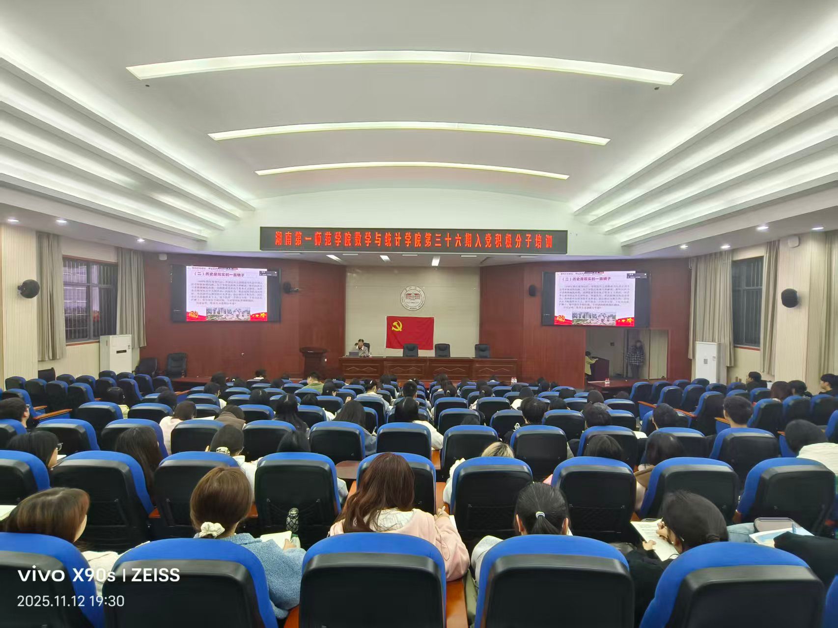 党课第一部分以“胸怀远大目标,把准前进方向”为主线,深入阐释共产主义远大理想和中国特色社会主义共同理想的深刻内涵,强调要自觉把个人追求融入党和国家事业全局,明确人生定位与奋斗方向。第二部分“坚守理想信念,践行初心使命”,通过回顾党的光辉历程与先进典型事迹,深刻阐明理想信念是共产党人精神上的“钙”,激励师生始终牢记全心全意为人民服务的根本宗旨,永葆共产党人政治本色。第三部分“掌握科学真理,筑牢信仰根基”,系统讲授马克思主义基本原理及其中国化时代化的最新成果,引导师生深刻感悟真理力量、实践力量,夯实信仰基石、把牢思想之舵。第四部分“挺膺担当尽责,争当时代新人”聚焦实践落实,勉励青年师生把坚定理想信念转化为实干争先的实际行动,在学习和工作中脚踏实地、奋发进取,努力成长为可堪大用、能担重任的栋梁之材。