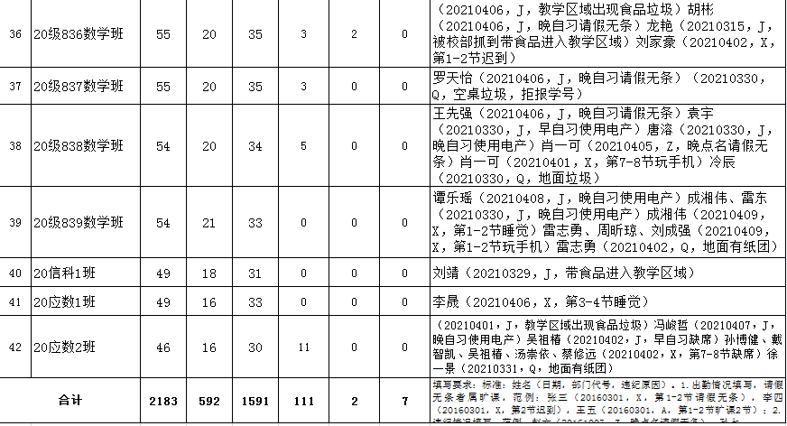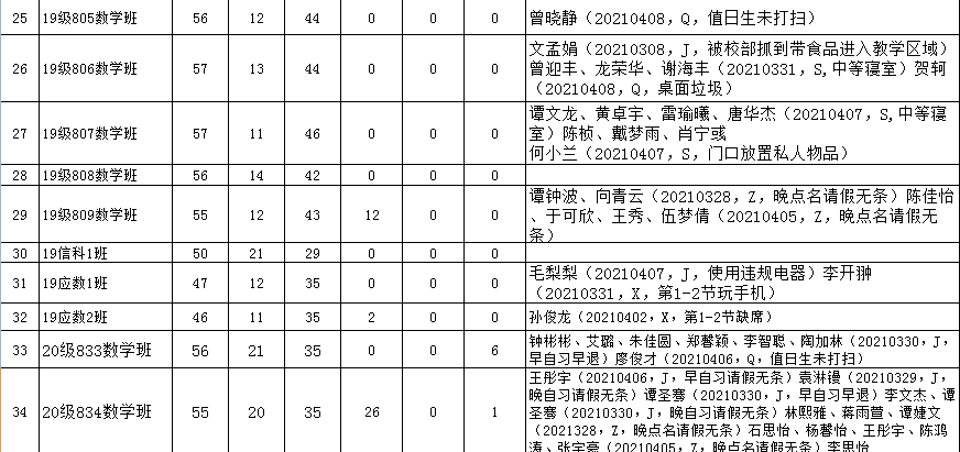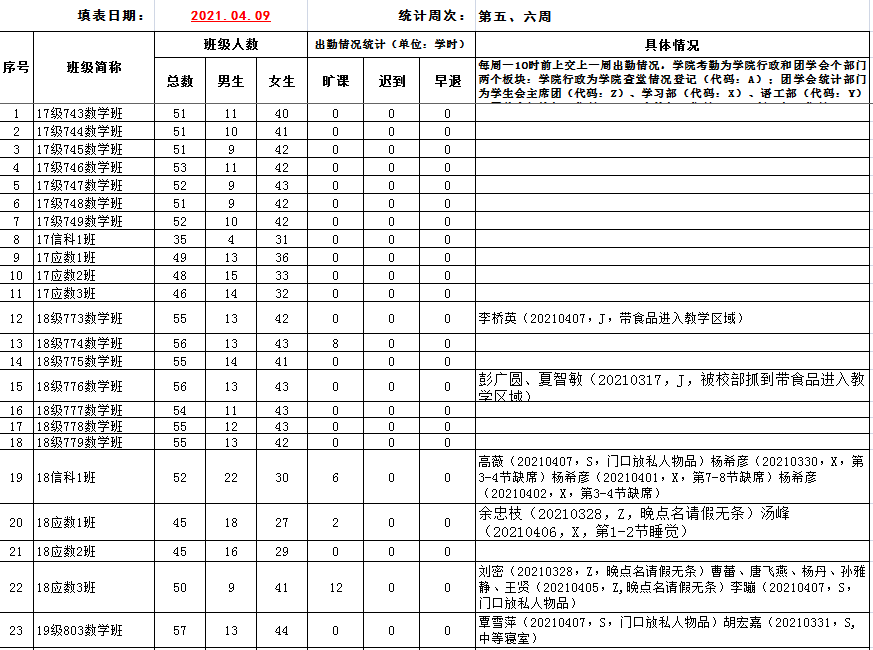 数学与计算科学学院2020-2021学年第二学期第五、六周考勤表