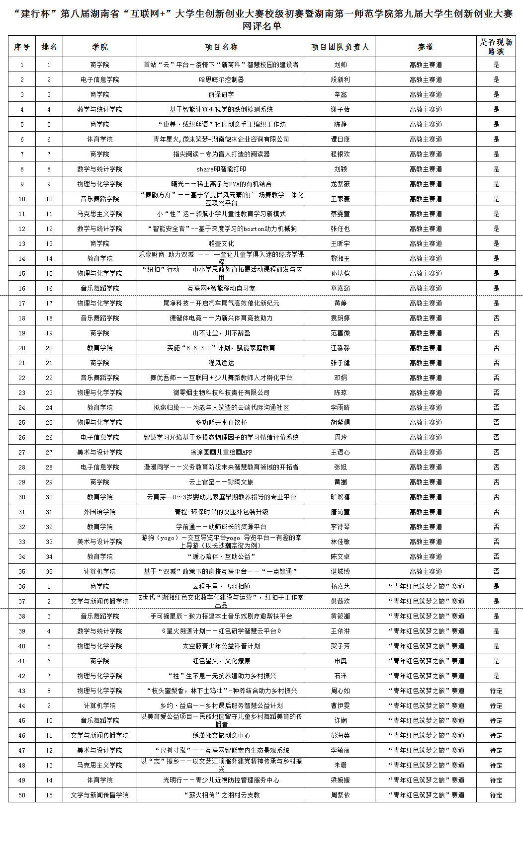 附件:“建行杯”第八届湖南省“互联网+”大学生创新创业大赛校级初赛暨伟德国际victor1946第九届大学生创新创业大赛 网评名单