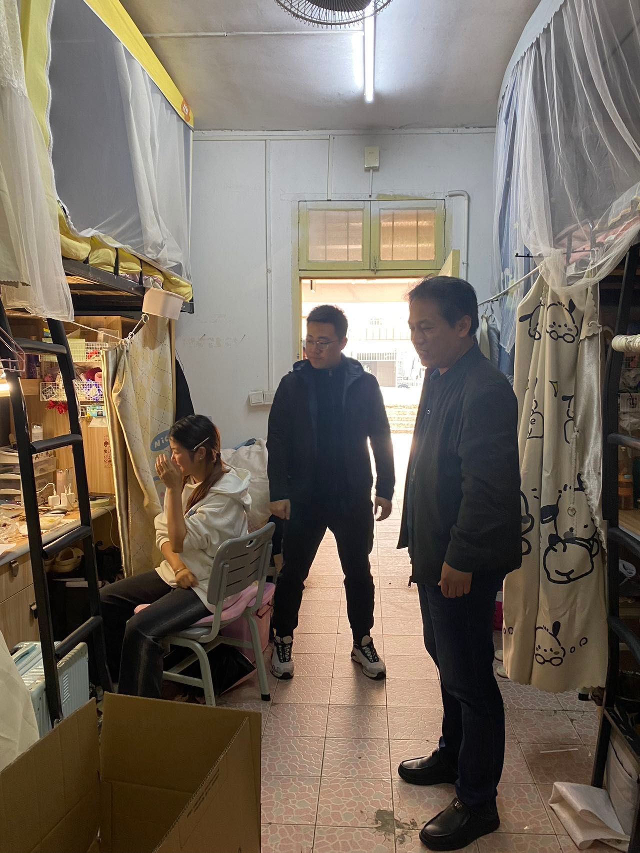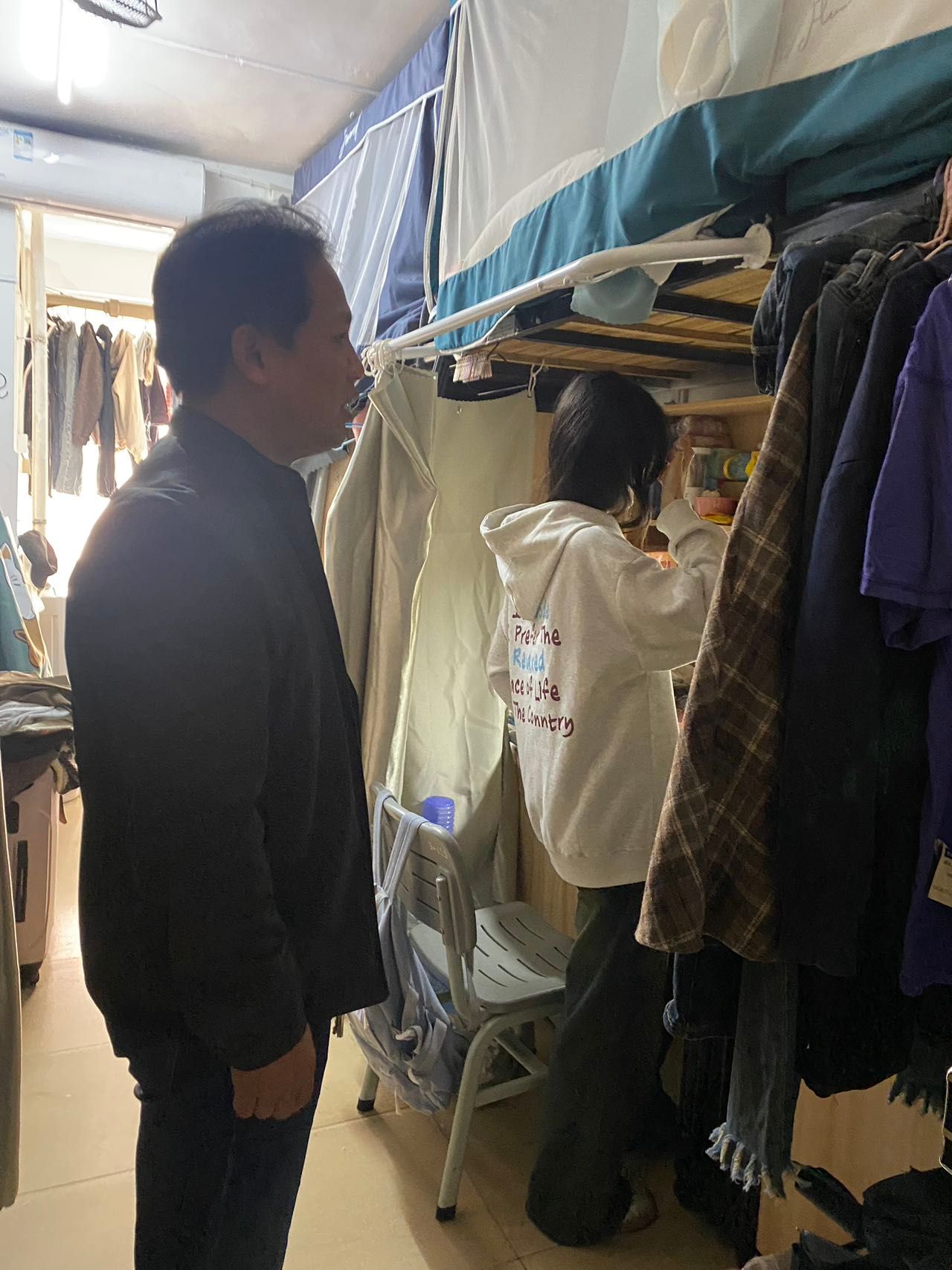 书记下寝 | 引导合理作息,守护学生安全 发布时间:2024-11-01 作者: 浏览次数:次 11月1日下午,伟的国际1946bv党委书记曾玉华带领辅导员走进4栋寝室,提醒学生们要珍惜大学时光,合理规划学习与休息时间,保持良好的生活习惯,同时也要加强自我保护意识,注意个人财物安全及用电安全。
