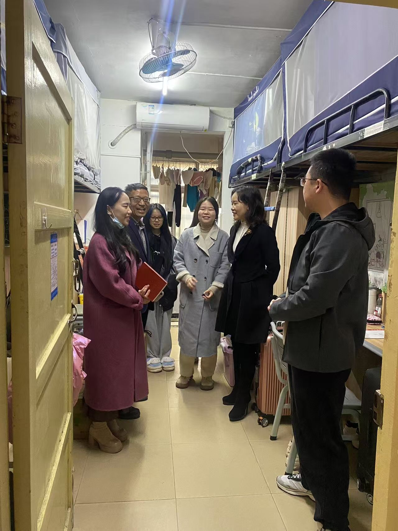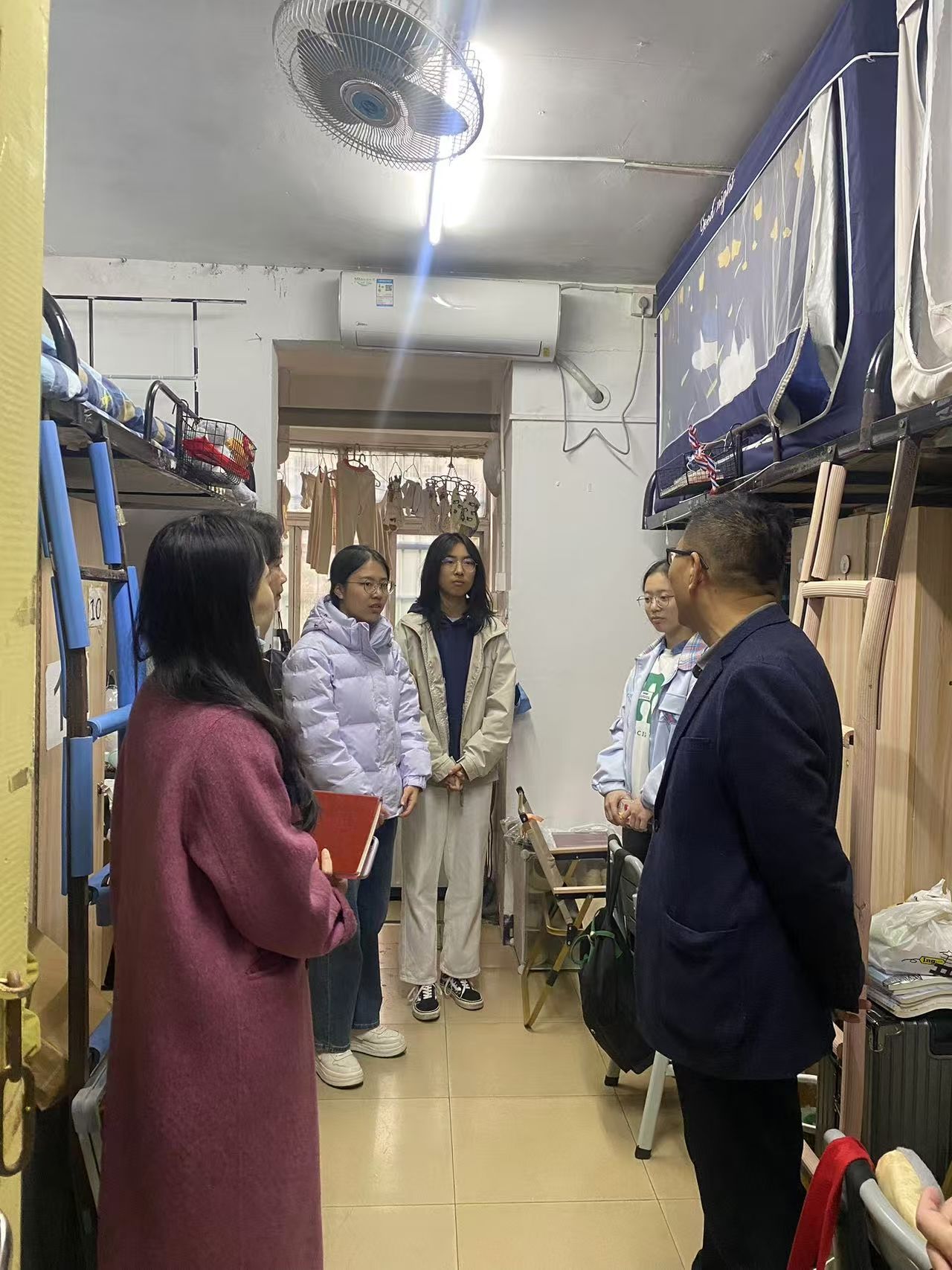 11月29日上午,伟的国际1946bv党委书记阮东彪、副书记申鸣凤带领全体辅导员深入学生宿舍走访,与学生亲切交流。阮书记详细了解同学们的学习进度、就业规划及面临的困难,用关爱的话语鼓励同学们坚定信心,为未来努力拼搏;他耐心倾听每位学生的心声,传递出学院对同学们的殷切期望和关心。在安全检查过程中,阮书记、申书记和辅导员们高度重视宿舍安全与卫生问题,他们仔细检查了宿舍的用电设施、消防安全及卫生状况,对存在的问题现场提出整改措施,确保同学们的生活环境安全、整洁;同时,提醒同学们要遵守学校规章制度,严禁使用大功率电器,防止火灾事故的发生。