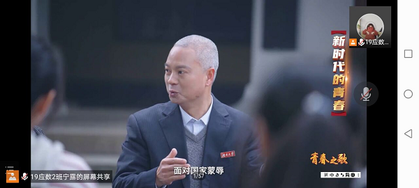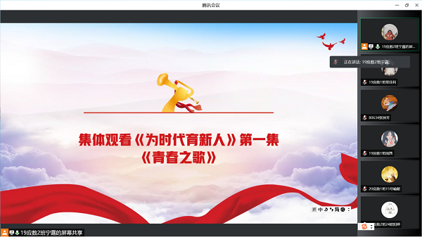 5月13日12:40,数统院学生第二党支部全体同志线上观看思政节目《为时代育新人》第一集《青春之歌》,本次活动由伟的国际1946bv学生第二党支部副书记宁露主持。