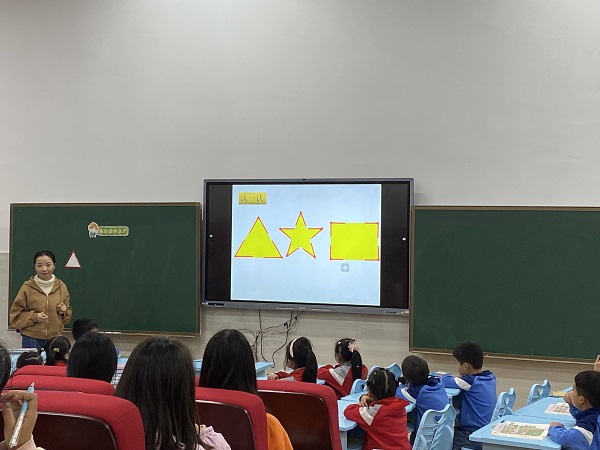 麓谷凌云小学潘景老师执教《角的初步认识》概念课。课堂开始,潘老师借助学生熟悉的动画人物小猪佩奇,营造了轻松愉悦的学习氛围,一开始便激发了学生的学习兴趣。然后,通过引导学生独立思考、自主探索比较角的大小的方法,引出“角的大小”这一概念,并通过讨论得出:角的大小和两条边张开的角度有关,与边的长短无关。最后通过对黑板上的角进行拓展延伸,让学生寻找生活中的角,自然地将书本知识与自己的实际生活紧密联系了起来,感受数学的魅力。