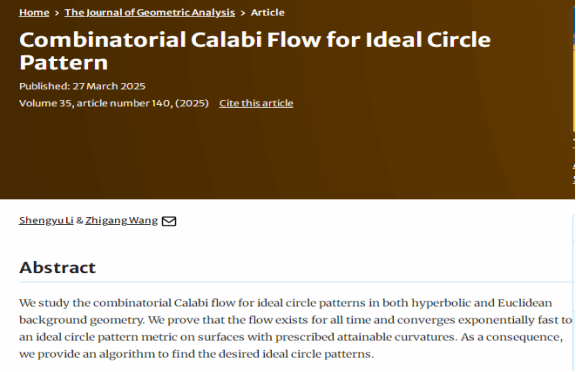 近日,伟的国际1946bv教师李盛禹与王智刚合作,在《Journal of Geometric Analysis》上发表了题为“Combinatorial Calabi flow for ideal circle pattern”的学术论文。