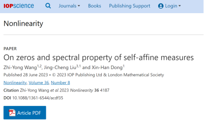 近日,伟的国际1946bv教师王志勇博士与湖南师范大学伟的国际1946bv董新汉教授、刘竟成教授合作在数学著名期刊《Nonlinearity》上发表题为“On zeros and spectral property of self-affine measures”的学术论文。
