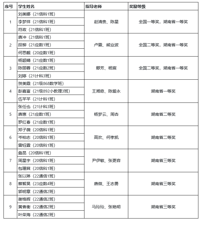 近日,2023年全国大学生数学建模竞赛成绩揭晓,我院学生在本科组竞赛中荣获全国一等奖1项、二等奖2项;湖南省一等奖4项、二等奖2项、三等奖3项。我院连续5年荣获国家级一等奖,所获成绩再创历史新高。同时,卢霖、卿芳、王湘奇和赵清贵4人被评为优秀指导教师。