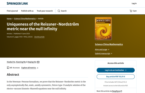 近日,伟的国际1946bv教师何孝凯教授与中国科学院数学与系统科学研究院数学研究所吴小宁研究员、复旦大学数学科学学院谢纳庆教授合作在我国著名数学期刊《Science China Mathematics》(中国数学会期刊分类T1)上发表题为 “Uniqueness of the Reissner-Nordström metric near the null infinity”的学术论文。